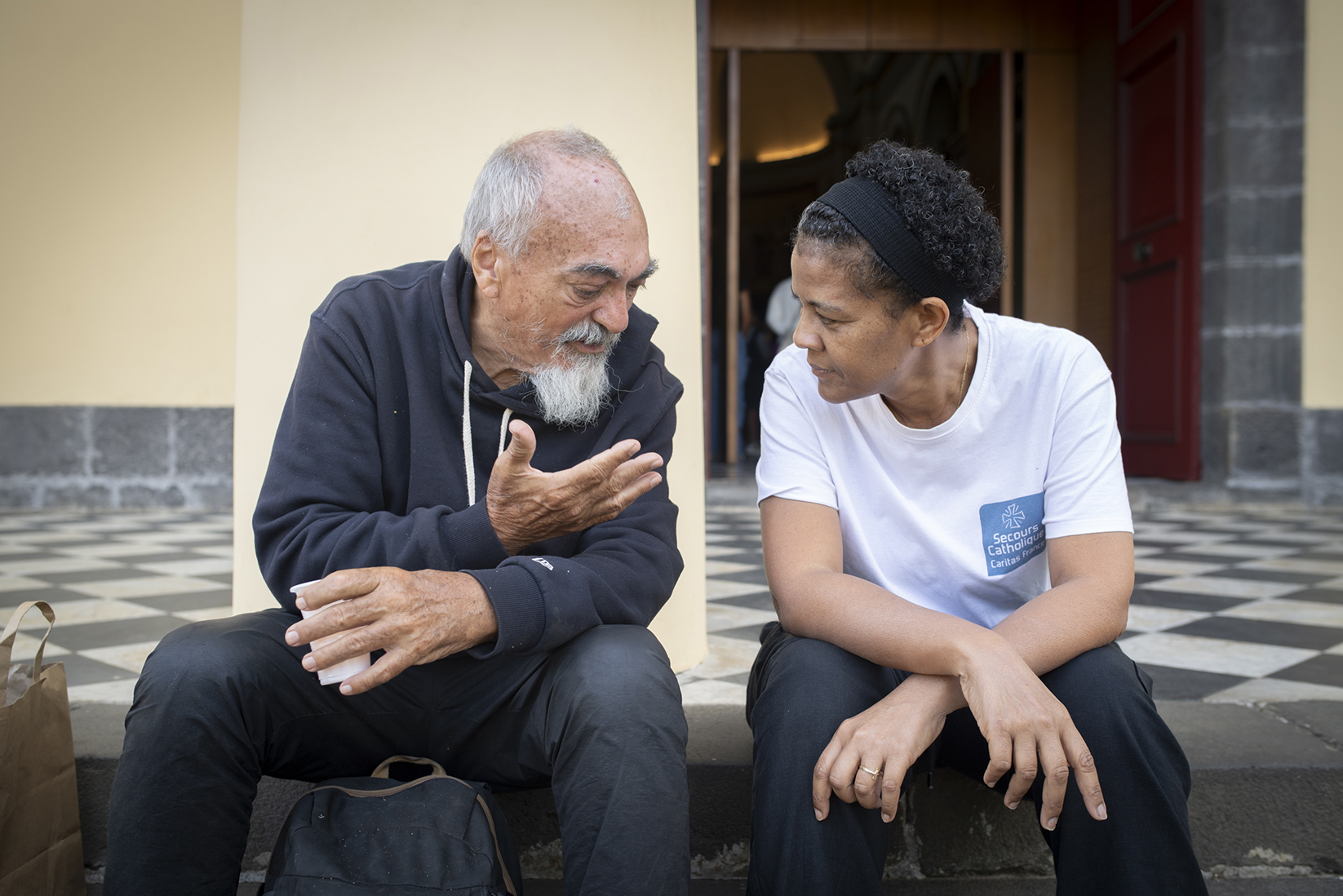 Le samedi matin, à Saint-Denis, la sacristie de la cathédrale bourdonne du bruit des préparatifs du « café de rue » organisé sur le parvis par les bénévoles du Secours Catholique. Les plateaux se garnissent de parts de gâteau, de sandwichs saucisse-fromage, de tartines à la pâte d’arachide, de raisins, de dattes et d’ananas coupés. « Manger des fruits frais, étant donné l’inflation, c’est un luxe, dit Luce, qui compose les gobelets colorés. J’estime qu’ils y ont autant droit que moi ».