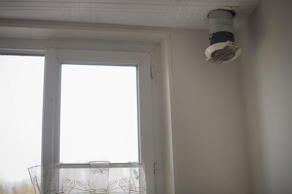 Derrière lui, la hotte de la cuisine ronronne. « C’est le propriétaire qui m’a dit de l’allumer, parce qu’il n’y a pas d’aération dans la cuisine. » Sur le mur du fond, sous le papier peint, un cercle d’une dizaine de centimètres de diamètre est apparu avec le temps. L’emplacement de l’ancienne aération.