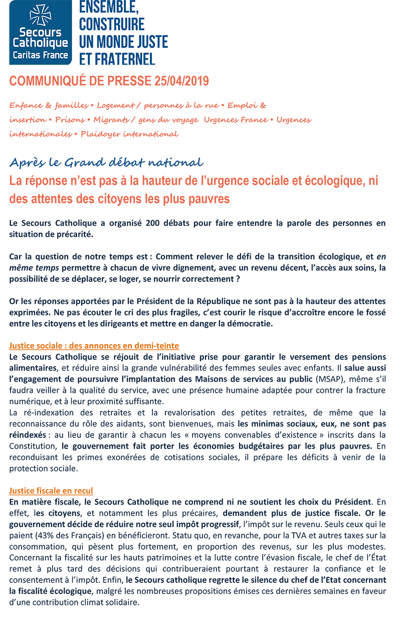 Grand débat : « La réponse n’est pas à la hauteur de l’urgence sociale et écologique, ni des attentes des citoyens les plus pauvres.
