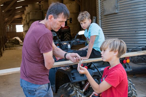 C'est l'heure du bricolage. Marcel a décidé de fabriquer une caisse, sur l’arrière du quad, pour y entreposer outils et piquets. Les enfants lui transmettent les outils, tiennent le mètre, marquent au feutre les mesures, lui posent des questions sur le fonctionnement de la perceuse, ou encore tiennent la planche à l’autre bout pendant qu’il scie. Mathéo signe son prénom sur l’œuvre finalisée, son frère l’imite.